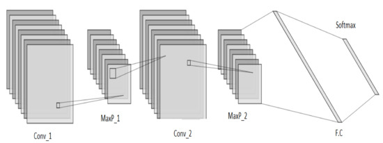 In this research work, a 2D-CNN is designed which takes its input as a feature matrix . The CNN is comprised of two stacked hidden layers, a fully connected layer, batch normalization layer and a softmax layer for classification, as shown in Figure 4. Each hidden layer is a stack of “Convolution–ReLu–Maxpool” layers. The convolution layer outputs a feature map which is passed through the “Rectified Linear Unit (ReLu)” piece-wise linear function (). The output of ReLu becomes the input to the pooling layer. Among various sorts of pooling techniques, max pooling chooses the greatest component from each block in the feature map. The pool size deals with the block to be covered and is kept as . Padding is set to “SAME”, and the stride is set as , such that the whole input block is covered by the filter.