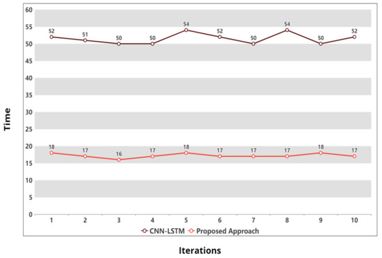 Furthermore, a comparison of the average execution time of the proposed model was carried out with the CNN-LSTM approach on dataset A. Continuing with our explanation, we have represented 5 min (300 s) as 5 units of time. Figure 5 exhibits the difference in execution time of both approaches on 10 iterations (X-axis) where a single iteration refers to one complete execution (predictions) of each approach. Moreover, each label (0, 5, 10, ...., 60) on the Y-axis represents a difference of five units. It can be observed for the first iteration that the CNN-LSTM approach took 52 units of time for one complete execution, whereas the proposed approach took only 18 units of time while employing three deep learning models. Similarly, after 10 iterations, the average execution time for the CNN-LSTM approach is calculated to be 51.50, whereas the proposed approach demonstrates an average execution time of 17.20 units.
