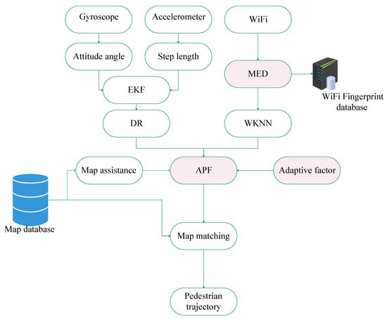 The gyroscope and accelerometer of the smartphone collect angular velocity and acceleration. Using the integral technique obtains the attitude angle. Using the gait technique obtains the pedestrian step length. DR based on direction and step length is used to estimate the position of pedestrians. The process of WiFi fingerprint localization can be divided into the offline fingerprint database construction stage and the online fingerprint matching stage. The reference points of the positioning area are calibrated in advance, and the fingerprints corresponding to the reference points are collected at the same time. The interpolation technology is used to construct the fingerprint database in the positioning area. In the online phase, MED is used to calculate the distance between the WiFi fingerprints collected online and the fingerprints in the database. The weighted K nearest neighbor (WKNN) algorithm further improves the positioning performance by selecting K WiFi matching results. The DR model is used as the state transfer equation of the particle filter, and the difference between the positioning results of WiFi and inertial navigation is used as the observation equation. An adaptive factor is proposed to improve the weight of highly trusted particles. At the same time, map information is introduced as an auxiliary means to eliminate particles crossing the wall. If the particle crosses the wall, its corresponding weight is set to zero. Finally, map matching is used to further reduce the pedestrian position error. The algorithm framework of MED and APF is shown in Figure 1.
