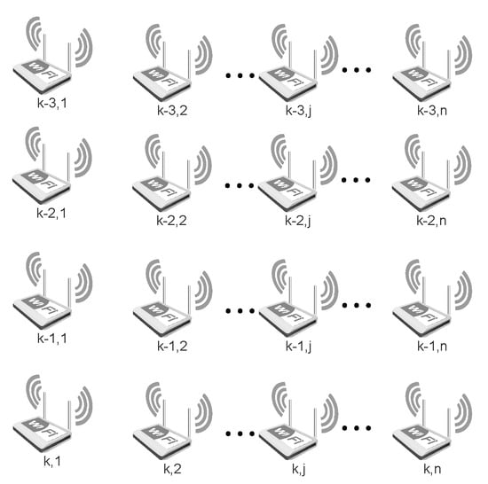 A multidimensional fingerprint algorithm is proposed here to solve the jump point problem. By increasing the amount of historical fingerprint information and reducing the impact of single fingerprint matching, the fingerprint matching algorithm becomes more stable. In this case, n represents the number of WiFi access points collected simultaneously; the square represents the RSS of the access point; and k denotes the time at which the WiFi fingerprint was collected; see Figure 4.