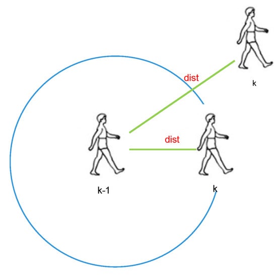 In the improved particle filter, the weight of particles depends not only on the observation but also on the distance between the particles at the current moment and the historical moment. Considering that the pedestrian walking speed is usually 1 m/s to 1.5 m/s, the pedestrian position is constrained by the walking speed. The position of the previous moment is the center of the circle, and the distance between the position of the current moment and the position of the previous moment is the radius of the circle, forming a circle, as shown in Figure 5. As you can see from the figure, when the particles are in the circle, the weight of the particles should be higher. When the particles are outside the circle, the farther away the particles are, the lower the weight of the particles is. As such, an adaptive factor is proposed to calculate particles’ weight: