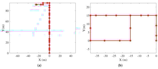 The walking experiment was carried out in office buildings A and B. The test scene included metal, wood, and concrete structures. An adult male with a height of 1.7 m holds a smartphone to collect data and walks at a speed of 1 m/s to 1.4 m/s. The tester opens the software at the starting point and clicks the “Start Saving a Log File” button to start collecting data. Click the “Stop Saving” button at the endpoint to save the data. The mapper’s actual position was measured using a laser rangefinder. In the offline phase, the tester walked from the starting point to the end point while holding the smartphone while the smartphone’s WiFi chip collected the RSS value of AP. The WiFi fingerprint database was established based on the laser rangefinder and the corner of the used corridor. In the online phase, each test pedestrian held a smartphone which obtained the RSS value of AP at normal walking speed. The experimental walking distance in office buildings A and B was 123 m and 138 m, respectively. The real trajectory is shown in Figure 6. The circle represents the reference point. These reference points are used to calculate errors and evaluate the performance of the algorithm.