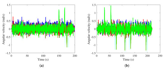 When the gyroscope obtains the angular velocity, the increment of the three-axis angular velocity velocity can be calculated as follows [26]: