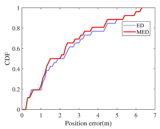 Figure 9 shows the relationship between position error and cumulative distribution function (CDF). Compared with traditional ED, MED uses multidimensional fingerprints to effectively reduce the error caused by abnormal fingerprints.