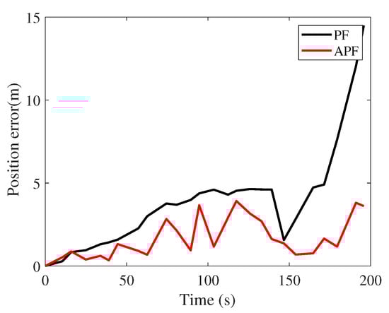 Figure 10 displays the position error of the traditional particle filter (PF) and adaptive PF. The APF positioning error tended to be lower than that of the traditional PF. APF uses map topology to constrain the particle range. In addition to being determined observationally, the particle weight is related to the distance between particles’ current and historical positions: the farther the distance, the lower the reliability.
