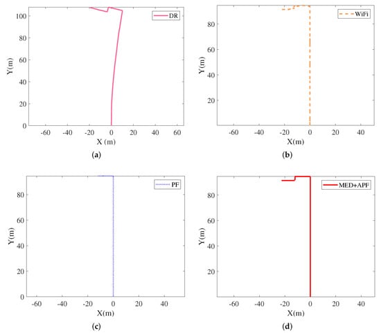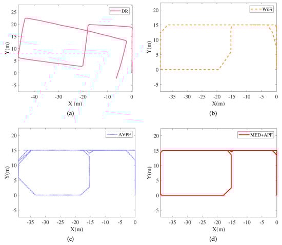 Positioning trajectories with different strategies. (a) DR; (b) WiFi; (c) PF; (d) MED+APF.