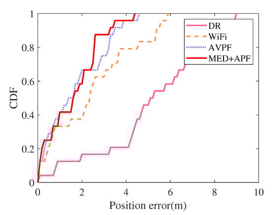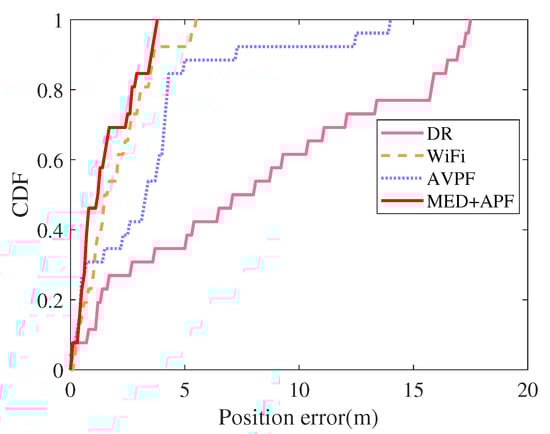 An adult man held a Nexus 5X smartphone that collected acceleration, angular velocity, and WiFi signals. Auxiliary value particle filter (AVPF) uses maps to determine particle weights [32]. If the particle crosses the wall, set its corresponding particle weight to zero. DR, WiFi, AVPF [32], and MED+APF positioning trajectories appear in Figure 13. the CDF of error is listed in Figure 14. DR exhibited an obvious cumulative error: the longer the running time, the greater the position error. The longer the running time, the greater the position error. The pedestrians’ position error was small when first walking, yet as their walking time increased, the position error deviated clearly from their actual position. The WiFi signal also fluctuated because fingerprint acquisition and matching occurred at different times, leading to mismatched WiFi fingerprint matching. Mismatching caused a particularly prominent error in the corridor corner. AVPF uses map assistance to detect particles’ validity and sets the particle weight to zero if the particle crosses the wall. Meanwhile, the map-matching algorithm further reduces position error. By adding dimension-related information from historical WiFi fingerprints, this work first employed MED to calculate the distance between WiFi online fingerprints and fingerprints in the fingerprint database. Then, considering the distance relationship between particles’ current and historical positions, an APF algorithm was proposed by introducing an adaptive factor.