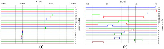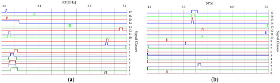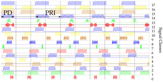 From the waveforms of changes of individual parameters presented in Section 2.1 (Figure 2 and Figure 3), the overlapping of individual classes of signals can be noted, taking into account time and frequency dependencies. Table 2 below depicts the classes with overlapping ranges of changes in time (PRI, PD, SP) and frequency (RF).