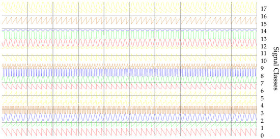Figure 4. Examples of generated waveforms for the parameters PD and RF for 18 classes.