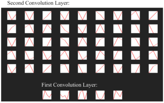 The first CNN layers in this structure, in this case the convolutional layers 1D, are designed to extract the features from the signals tested [60]. Traditional convolutional 2D layers operate on images and use the 2D filters to extract features of input signal, where convolutional 1D layers have 1D filters and operate directly on the 1D signal without transformations (such as transforming signal 1D to a spectrogram). Extraction of selected signal features is carried out by the means of a convolution operation of the input signal with feature maps (filters) obtained during the learning process. Figure 7 shows examples of signal filters (visualization of weight maps) obtained during the learning process. Due to the CNN structure used together with the one-dimensional convolution layers, the illustration of these filters was presented in the form of sampled time waveforms.