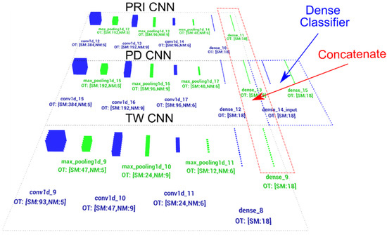 The second CNN structure uses three structures similar to the model described above. The structures are connected by concatenate layer [63] and work together simultaneously processing PRI, PD parameters and TW to determine the class of input signals. The last layer of this structure is the dense type and makes final recognition of the signal (Figure 8 and Table 4). The model described here is depicted in more detail in Figure 8.