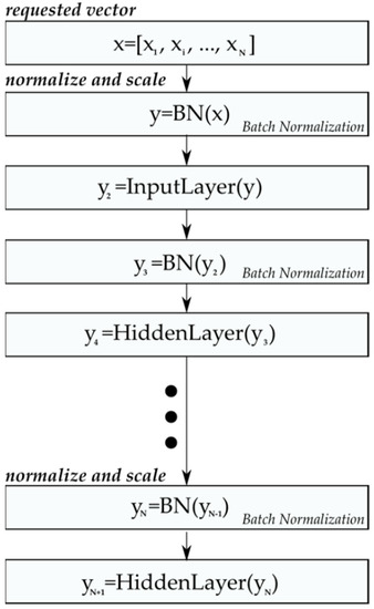 where is the number of the current training packet (mini-batch [57] number), is the number of elements in the packet, is the average value of the training packet, is the variance of the teaching packet, is the normalized input training vector, and is the normalized and scaled training vector. Algorithm 1 presents the exemplary of batch normalization procedure for an input vector X.