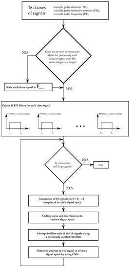 Opponents of artificial intelligence methods, especially deep learning methods, will point out here that the learning process may take too long in relation to the use of manually programmed filters/processing algorithms. However, in the case of deep neural networks, it is possible to use already learned filters from convolutional layers [40,41,42,43,44]. The only problem that remains then is teaching a three-layer neural network, which is usually learned quite quickly in relation to convolutional layers [35,42,45,46,47]. Another cause for optimism is that modern graphics cards make it possible to reduce the training time of ANN classifiers from several weeks to hours or even minutes (here the leaders in this field are NVIDIA and AMD) [30,31,48]. The ANN processing methods discussed in this article will operate on digital signals, and will show the possibility of optimizing the methods of classifying these radar signals depending on the receiver that produces a given signal, as well as the acceleration of the processing itself. The nature of ANN structures and their operation can be used for data processing, and for signals at higher frequencies directly or indirectly (after rescale or transforming high-frequency signals to the lower baseband frequency) in which the telecommunications or radiolocation devices operate [8,39,49].