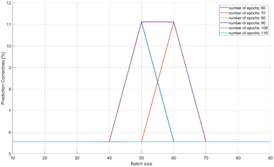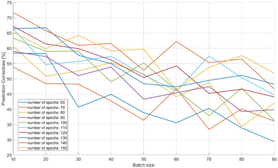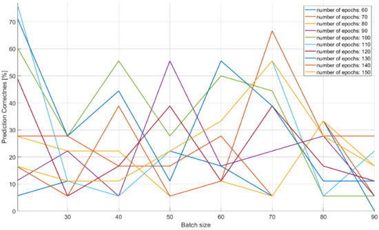 In the case of CNN analysis for the PRI parameter (Figure 14) in relation to the PD analysis (Figure 13), the results achieved are much better: approximately 70% of the effectiveness of the training package with the size of 20 elements and 60 epochs in the learning process. With larger packages at the level above 70, the quality of learning and CNN performance showed a descending trend.