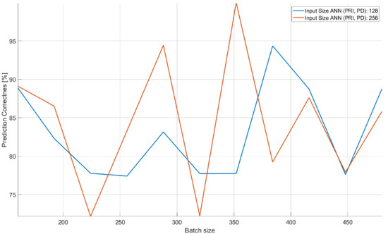 An important parameter that influences the qualitative operation of the structure (Figure 7, Table 4) is the size of the input vector accepted by the CNN. In this case, the size of CNN inputs, which analyzed the PRI and PD parameters, changed at the same time. The characteristics clearly indicate that the possibility of accepting a larger vector of samples (longer observation time) improved the efficiency of signal classification. The size of the package also turned out to be important. In this case, it should be at the level of about 350 elements for the CNN to achieve high effectiveness in the learning process.