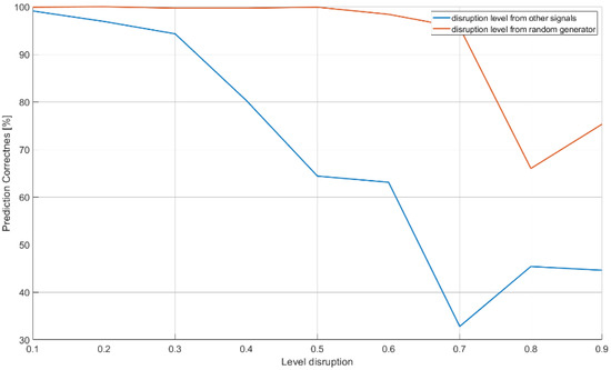 The blue curve in Figure 17 shows the effectiveness of the CNN in the case of recognizing radar signals when there are a certain number of radio sources at different distances around the reconnaissance station. The noise levels (horizontal line) illustrate the signal amplitude level of interfering sources. The interfering signals, in this case, were signals for the 18 classes of radar signals examined earlier. To simulate the disturbance effect, the generated signals for the 18 classes to be recognized were superimposed on the remaining signals with a given amplitude (0.1–0.9). The red curve shows the disturbance noise.