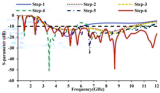 Evolution stages of the antenna element: (a) step 1, (b) step 2, (c) step 3, (d) step 4, (e) step 5, (f) step 6.