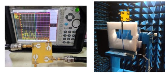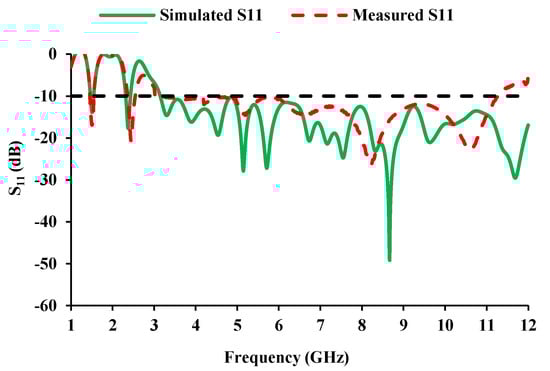 - The proposed antenna requires less space than the antenna configurations reported in [,,,,,,,,,,,,,,,].