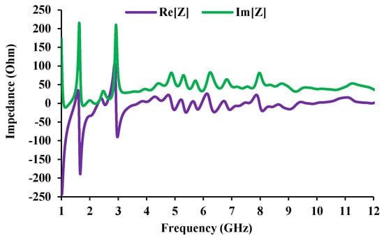 The impedance characteristics determine the type of resonant circuit. When the impedance moves from low (negative) to high (positive), a series resonance circuit is drawn, and when the impedance moves from high (positive) to low (negative), a parallel resonance circuit is drawn []. The real and imaginary curves (shown in Figure 5) can be used to draw the RLC equivalent of the antenna. The equivalent circuit of the antenna element and the corresponding result is shown in Figure 6, and the corresponding RLC parameters are given in Table 2. The 1.5 GHz and 2.45 GHz frequencies are contributed by two parallel resonant circuits, and the UWB is supported by two series resonant circuits.