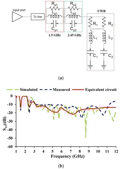 Equivalent circuit of the antenna (a) model, (b) S-parameters.
