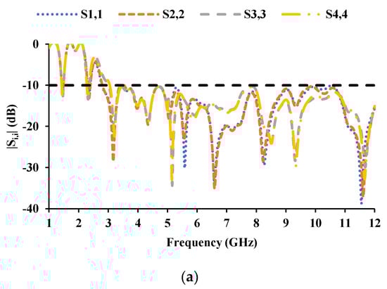 The inter-element spacing between the radiators is kept as 0.06λ0, and the MIMO antenna dimensions are 56 mm × 56 mm. Figure 7 and Figure 8 show the proposed MIMO/diversity antenna and its S-parameters without a connected ground plane, respectively. The MIMO antenna with a common ground plane [] is shown in Figure 9. The reflection coefficients and mutual coupling of the MIMO antenna with a connected ground plane are presented in Figure 10a–c, respectively. There are no significant differences in the performance of the antenna with or without connected ground. The photograph of the proposed MIMO antenna prototype is shown in Figure 11.