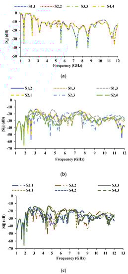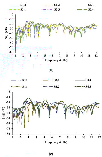 S-parameters of the MIMO antenna with unconnected ground planes: (a) reflection coefficients, (b) mutual coupling with respect to port 1 and port 2, (c) mutual coupling with respect to port 3 and port 4.