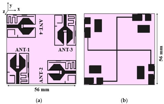 Layout of the proposed MIMO antenna with a common ground plane: (a) front view, (b) rear view.