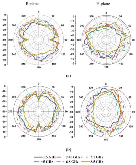 The radiation patterns of the antenna in the E-plane and H-plane are displayed in Figure 12. Figure 13 depicts the gain and efficiency of the proposed antenna. The maximum gain is found to be 2.14 dBi, and the maximum efficiency is 87%.