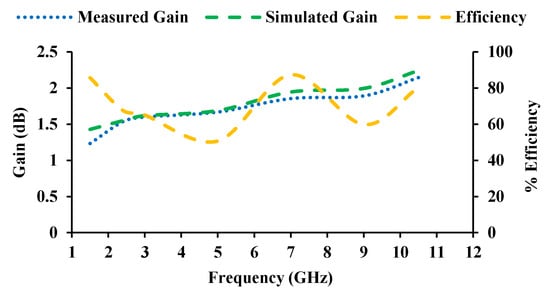 Measured gain and efficiency of the designed antenna.