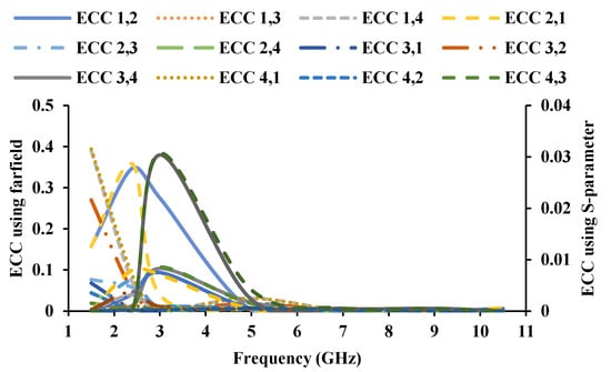 The diversity characteristics of the MIMO antenna are examined for its use in automobile applications. Envelope correlation coefficient (ECC) can be calculated with the S-parameter (Equation (1)) and the far-field (Equation (2)) [], and the calculated ECC is less than 0.4, as shown in Figure 14.