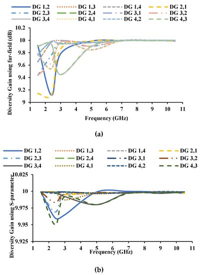 DG of the proposed antenna (a) using far-field, (b) using S-parameters.