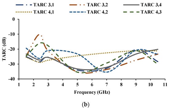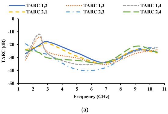 The total active reflection coefficient (TARC) is the square root of the summation of outgoing powers divided by the summation of incident powers at any port of an N-port antenna []. TARC is estimated using the Equation (7), where ai is the incident signal and bi is the received signal. TARC of the proposed antenna is less than −10 dB, shown in Figure 16.