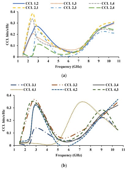 CCL of the proposed antenna (a) with respect to port 1 and port 2, (b) with respect to port 3 and port 4.