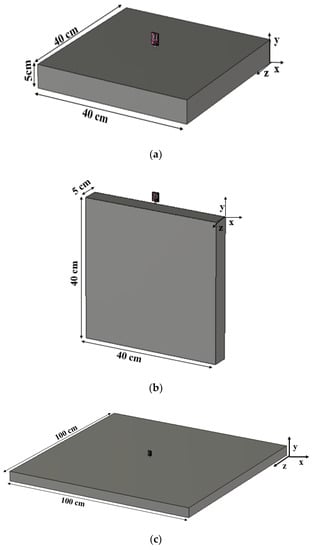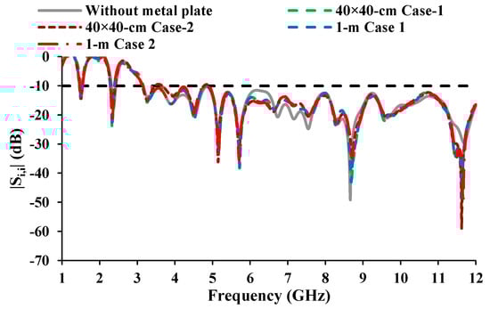 The reliability of the antenna in the automotive environment is investigated, taking into account the housing effects []. The roof of the car is represented by a metal plate. The antenna is placed in the xz-plane and yz-plane, and the reflection coefficient characteristics in the presence of a conductor are investigated. The dimensions of the metal plate are kept as 40 cm × 40 cm and 1 m × 1 m (shown in Figure 18), and the gap between the antenna and the metal plate is marked as 10 mm. The results demonstrated (shown in Figure 19) that the performance of the antenna is not much affected by the metal conductor.