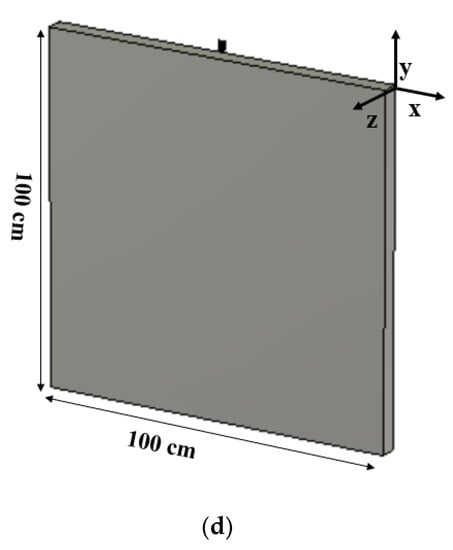 Housing effect of the antenna: (a) 40 cm × 40 cm, case-1, (b) 40 cm × 40 cm, case-2, (c) 1 m × 1 m, case-1, (d) 1 m × 1 m, case-2.
