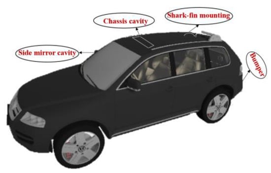 The various locations in a vehicle where the proposed antenna can be installed are depicted in Figure 20. The antenna can be mounted on the bumper, roof, rear window, or side mirrors. The distance between the antenna and the ground should be larger to avoid ground losses. Therefore, the roof of the vehicle is the best place for antenna mounting. The antenna can be mounted on the roof using a shark-fin mounting system or in the chassis cavity.