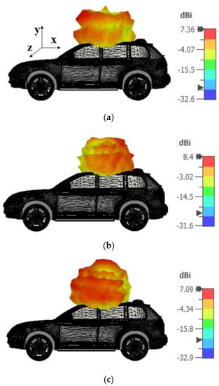 Furthermore, the antenna is imported into an open-source CAD model to evaluate its directivity for on-vehicle conditions. Additionally, the far-field performance of the proposed antenna is investigated for an on-car scenario. The results showed that the antenna has omnidirectional characteristics over the desired frequencies. The proposed antenna has directivity greater than 7 dBi, as shown in Figure 21.