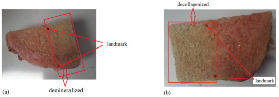 An artificial horizontal landmark line in each sample was used to distinguish the measurement points. The points below this landmark of the sample were immersed in the liquid solution. The points above this landmark were not affected by the solution (Figure 2a,b), so were not demineralized or decollagenized. The points above the landmark were used as a reference to reveal the changes in the US/PA signal due to factors before and after demineralization/decollagenization. The frequency spectra of PA and US signals were normalized by those spectra. In this study, we used the apparent integrated backscatter/back-propagating (AIB) [17,23,31] parameter, which is determined by frequency averaging (integrating) the ratio of the power spectrum of the signal (Pb) over the power spectrum of a reference signal (Pr) over the chirp frequency range: