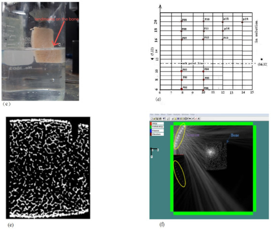 (a) Landmarks (two points indicated on the sample) were artificially created to distinguish the measurement points and mark the horizontal line below which the sample was immersed in the solution agent. (b) Landmarks (two points indicated on the sample) were artificially marked on the decollagenized sample. (c) The indicated line coincides with the surface of the solution. (d) The relative position of the 16 measured points landmarked on one sample. (e) DICOM image of a bone sample scanned using µCT; the extra void spaces were cropped out. (f) Simulations were conducted using a commercial standalone software package for computational ultrasonics (Wave3000®).