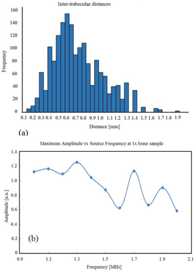 (a) Histogram of inter-trabeculae distances (mm) in the 25 slices of bone used for simulation; (b) maximum amplitude vs. source frequency for the original bone sample.