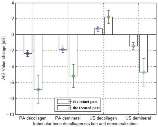 Figure 4 shows that both PA and US AIB values significantly reduced in the demineralized part of the bone.PA signals decreased significantly in the decollagenized part of the bone, whereas US parameters increased slightly in the decollagenized part. Several points of each sample (demineralized or decollagenized) were tested, and the average changes in the US and PA AIB values of each group of samples are shown in Table 1. The averaged correlation coefficients are weak to moderate for the intact parts of all samples with r values ranging from 0.468 to 0.632, which are relatively small compared with those between the US AIB and μCT. Additionally, the PA AIB showed weak correlation with μCT before and after either treatment, as previously reported [22,31].