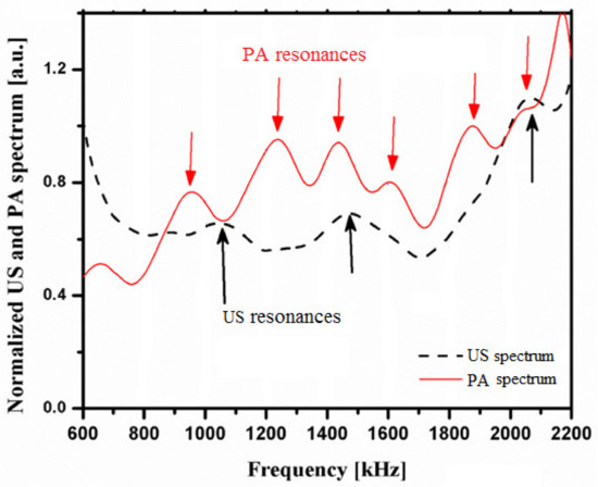 In Figure 5 and Figure 6, several peaks occur in both the US and PA spectra. This shows that the resonance phenomenon is present in both PA and US signals.
