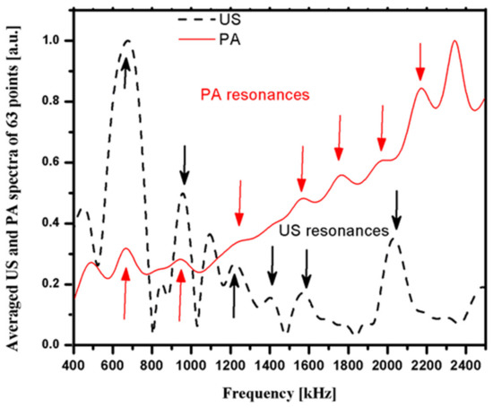 By increasing the number of measurement points to 63 on the same sample, we normalized the average of the 63 detected signals to generate the US and PA spectra in Figure 6, where some similar resonances on both PA and US can be observed.