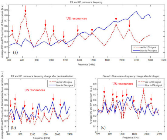 Normalized spectra for US and PA signals vs. source frequency. (a) PA and US resonance frequency. (b) PA and US resonance frequency change after deminieralization. (c) PA and US resonance frequency change after decollagenization.