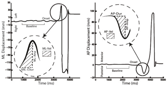 CoP was low-pass filtered at 10 Hz (Butterworth, 4th order) [48]. Baseline values of AP and ML CoP displacements were identified within the first 2.5 s at the beginning of each trial when subjects were asked to stand still (see Figure 1). ML and AP APA onsets were defined as the instants when the first-time derivative of the relative CoP displacement exceeded three standard deviations from the baseline. Due to the laboratory reference system and the orientation of participants, ML and AP peak were identified using different approaches. Specifically: (i) ML APA peak was identified as the ML CoP maximum within 1 s after ML APAs onset; whereas (ii) AP APA peak was identified as the AP CoP minimum within 1 s after AP APAs onset (Figure 1). The reference system was adjusted across the conditions to allow the identification of the instants as described above; particularly with the ML axis always pointed toward the stance leg [15,33]. The following parameters were computed (see Figure 1): APA-ML and -AP durations, amplitudes, and CoP velocity. APAs durations were calculated as the time difference between the identified APAs peak and APAs onset. APAs amplitudes were defined as the absolute value of the spatial difference between the CoP coordinates at APAs peak and at baseline. Lastly, CoP velocities were estimated as the ratio between APAs amplitude and APAs duration. The analysis was semi-automatically performed using customized software written in MatLab R2018b (The MathWorks, Natick, MA, USA).