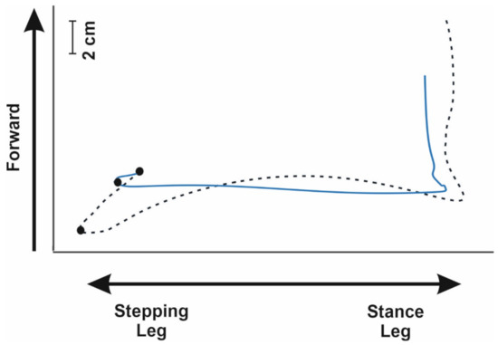 The results of the present study support and extend previous findings suggesting that, in lateral stepping, postural preparation is shorter in duration and smaller in amplitude compared to forward stepping [15]. To better highlight this circumstance, the 2D trajectory of a lateral stepping trial is reported in Figure 2, highlighting the comparison with a forward stepping trial of the same participant taken from an available dataset [33].