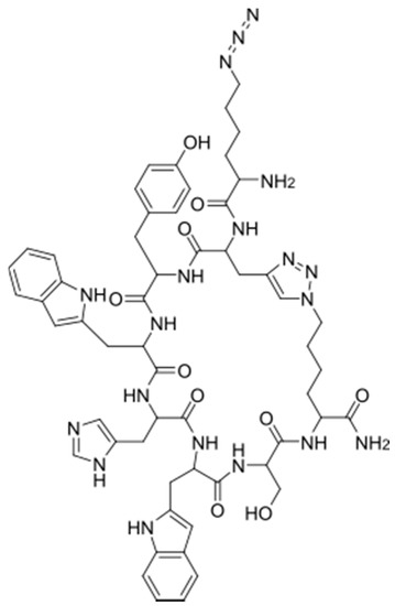 The E2-binding cyclic peptide (cy(YWHWS)) was synthesized and screened following previously established protocols [32]. Briefly, the linear peptide Lys(N3)-YWHWS-Pra was first synthesized on Rink amide resin using conventional Fmoc-based solid phase synthesis in a Biotage Initiator+ Alstra microwave synthesizer. The peptide was cyclized using copper(I) iodide (1.5 equiv.) and ascorbic acid (5 equiv.) in 4:1 NMP:piperidine overnight at room temperature. The residual copper was removed by shaking the resin with 5% (w/v) sodium diethyldithiocarbamate trihydrate and 5% (v/v) N,N-diisopropylamine in 1-methyl-2-pyrrolidinone for 8 min (2x). Lys(N3) was then coupled to the N-terminus and Fmoc was removed. The peptide was cleaved from the resin for 2 h with 87.5% trifluoroacetic acid (TFA), 5% water, 5% phenol, and 2.5% triisopropylsilane (TIPS), and then purified by reverse phase HPLC using a C18 column. The mass (cy(YWHWS) + H+) was confirmed by MALDI-TOF (calculated: 1181.3 m/z; actual: 1181.14 m/z; Figure S1 in Supplementary Materials).