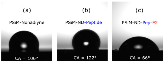 Contact angle measurements were taken after each preparation step to investigate surface wettability. Freshly etched PSi is innately hydrophobic due to the presence of silicon hydrides on its surface as well as the trapping of air within its porous structure. The water contact angle on the freshly etched PSiM was ~134° (avg = 130 ± 6°, N = 2) (see Figure S2 in Supplementary Materials). Subsequent surface modification alters the contact angle based on the wettability of the coating material. As shown in Figure 3a, after ND thermal hydrosilylation, the water contact angle was ~106° (avg = 105 ± 10°, N = 2). This high water contact angle on the PSi silicon surface suggests a good alkyne surface coverage following the attachment of 1,8-nonadiyne. Upon clicking the capturing peptide for E2 to the PSi surface, the water contact angle increased to ~122° (avg = 120 ± 4°, N = 2) (Figure 2b). Unfortunately, this low surface wettability inhibits the delivery of target protein from an applied aqueous solution into the pores as needed for sensing. As the peptide capture agents identified to have high affinity to the E2 protein generally include multiple hydrophobic amino acids [32], we expect that similar results as in Figure 2b would occur using other E2-capturing peptides. To mitigate this surface wettability issue, we modified our usual experimental protocol by including a vacuum-assisted technique to facilitate improved infiltration of the target E2 solution into the pores. After exposure of the sensor to the E2 protein by this approach, the contact angle on the PSi sample decreased to ~66° (avg = 68 ± 3°, N = 2), suggesting successful E2 capture with the surface becoming more hydrophilic from protein attachment in the pores. Optical reflectance measurements discussed in Section 3.3 confirm the specific capture of the E2 protein. In future work, we anticipate that the use of an alternative sensor architecture, such as a flow-through membrane in a microfluidic device, can mitigate the aforementioned transport challenges without the need for the vacuum assistance [38].
