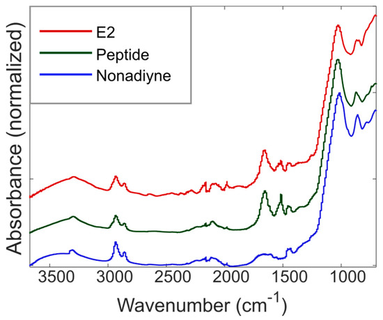 While the water contact angle measurements provide strong indirect evidence of the desired surface functionalization and target protein capture in the PSi sensors, ATR-FTIR measurements reveal direct evidence of the molecular attachments during functionalization via observation of absorption peaks that correspond to molecular vibrations of constituent chemical bonds. Figure 4 shows ATR-FTIR spectra obtained after each functionalization step and after exposure of the sensor to the E2 target protein. A peak near 3320 cm−1 and a weak peak at 2100–2140 cm−1 indicate the presence of the alkyne group associated with nonadiyne. In addition, strong peaks at 2860 and 2930 cm−1 corresponding to C-H stretching and a weak peak near 1668–1687 cm−1 indicating C=C stretching provide additional support of nonadiyne attachment. It is worth noting that sharp silicon hydride (Si-H) peaks near 2100 cm−1 observed for freshly etched PSi (shown in Figure S2 in Supplementary Materials) are absent due to the consumption of Si-H during the nonadiyne hydrosilylation reaction. After the click reaction with the azide-peptide molecule, there are two primary changes in the ATR-FTIR spectrum. First, the intensity of the peaks corresponding to the alkyne groups shows a decrease due to transformation of these groups during the click reaction. Second, the appearance of amide bands near 1650 and 1520 cm−1 further confirms the attachment of the peptide capture agent. We note that the persistence of the peak at 3320 cm−1 after peptide attachment, albeit attenuated, suggests that the conversion during the click reaction was not high and that many alkyne groups remained unreacted. Accordingly, peptide surface coverage may be improved by utilizing a longer click reaction time and/or an increase in the starting concentration of the azide-modified peptide. After incubation, amide band peaks associated with amino acids in the E2 protein are observed as well, but the changes are slight. Our interpretation is that the IR spectrum is compatible with the presence of both the capture agent and the E2 protein but does not confirm binding of the latter. We note that the IR spectrum after E2 exposure is consistent with the wetting and reflectance data in Section 3.1 and Section 3.3 that provide strong support of E2 binding to the capture agent. Approaches to improve transport of E2 protein into the PSIM are likely to increase binding, and these are being pursued. Overall, the surface modification method utilized in this work is straightforward, scalable, and can be applied to other sensing applications where biomolecules can be clicked onto a surface.