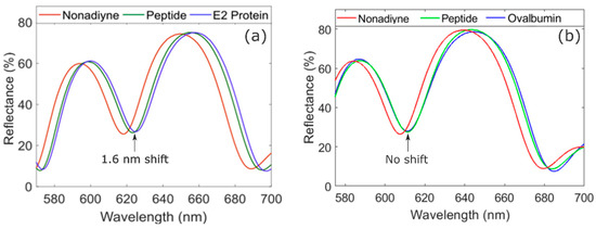 Reflectance measurements from E2 sensing and control experiments. (a) Reflectance spectra showing spectral redshift after clicking the peptide capture agent to the alkyne-terminated PSi sensor and an additional 1.6 nm spectral redshift after exposure of the peptide-modified PSi sensor to 1 µM E2 protein in DI water. The spectral redshifts confirm peptide functionalization and target E2 protein capture and detection. (b) Reflectance spectra for control experiment showing spectral redshift after peptide functionalization of the PSi sensor and no spectral shift after exposure of the sensor to 1 µM non-target chicken ovalbumin in water, which confirms the specificity of the peptide capture agent.